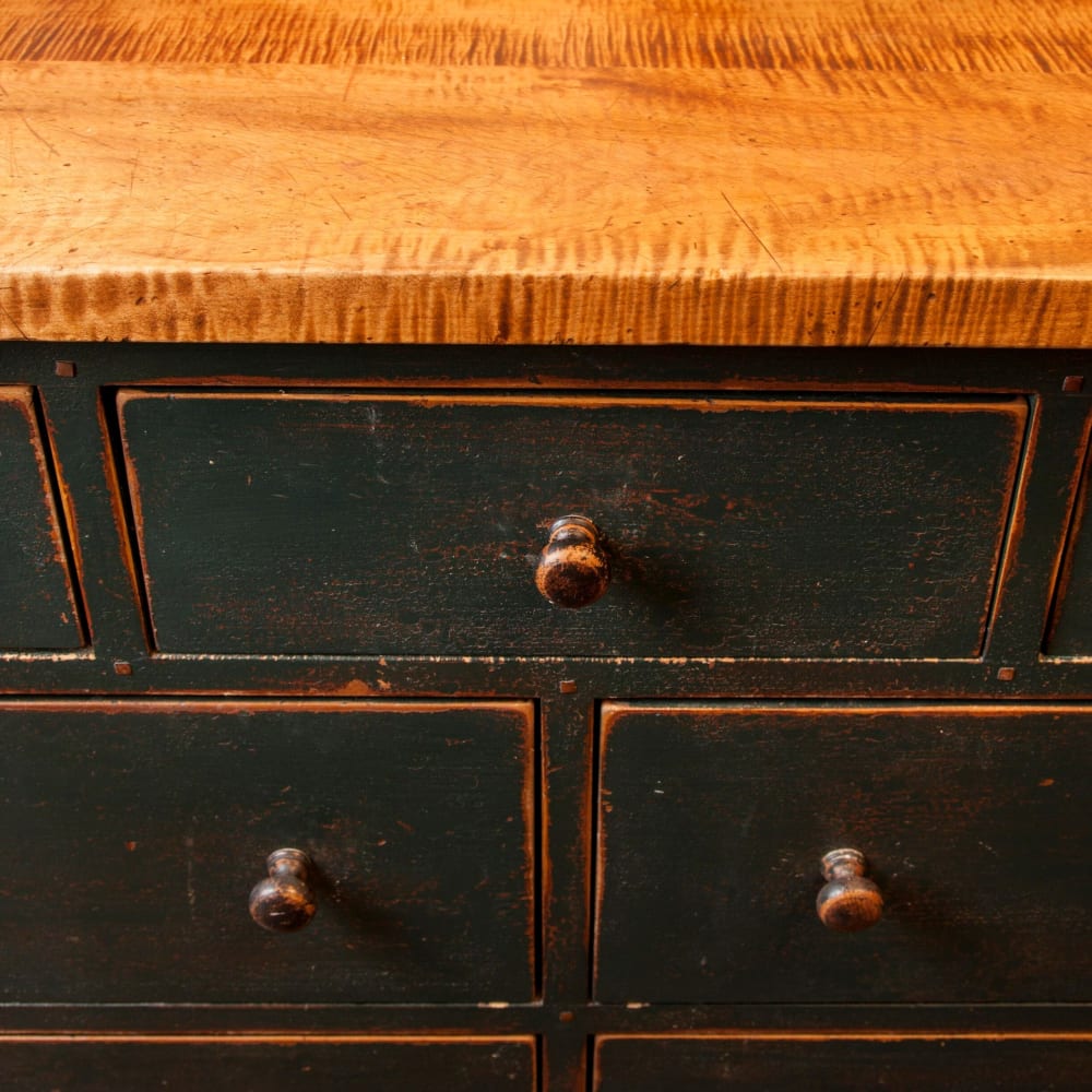 Our years of experience, and many years of research and study of antiques, have culminated into a finish which has the look and feel of one that was created 150 years ago. These pieces have what we call the "logical wear" of antiques. This wear is around the feet, the knobs, and on the edges of doors and drawers; anywhere the piece would have been logically rubbed, touched, or experienced wear. Every piece is worn a little differently to give each piece its own personality.